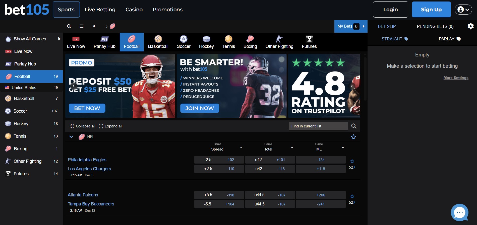 Bet105 is designed as a sharp sportsbook first, with a supporting casino section for extra entertainment between bets. It attracts players who look for reduced juice lines and competitive odds and is sometimes grouped with the best Texas sportsbooks used by experienced bettors. The main focus is on major US leagues and popular international competitions, while the casino area offers a concise set of slots, blackjack and roulette for quick sessions. The layout is clean and numbers driven, aimed more at efficiency than at big graphics.